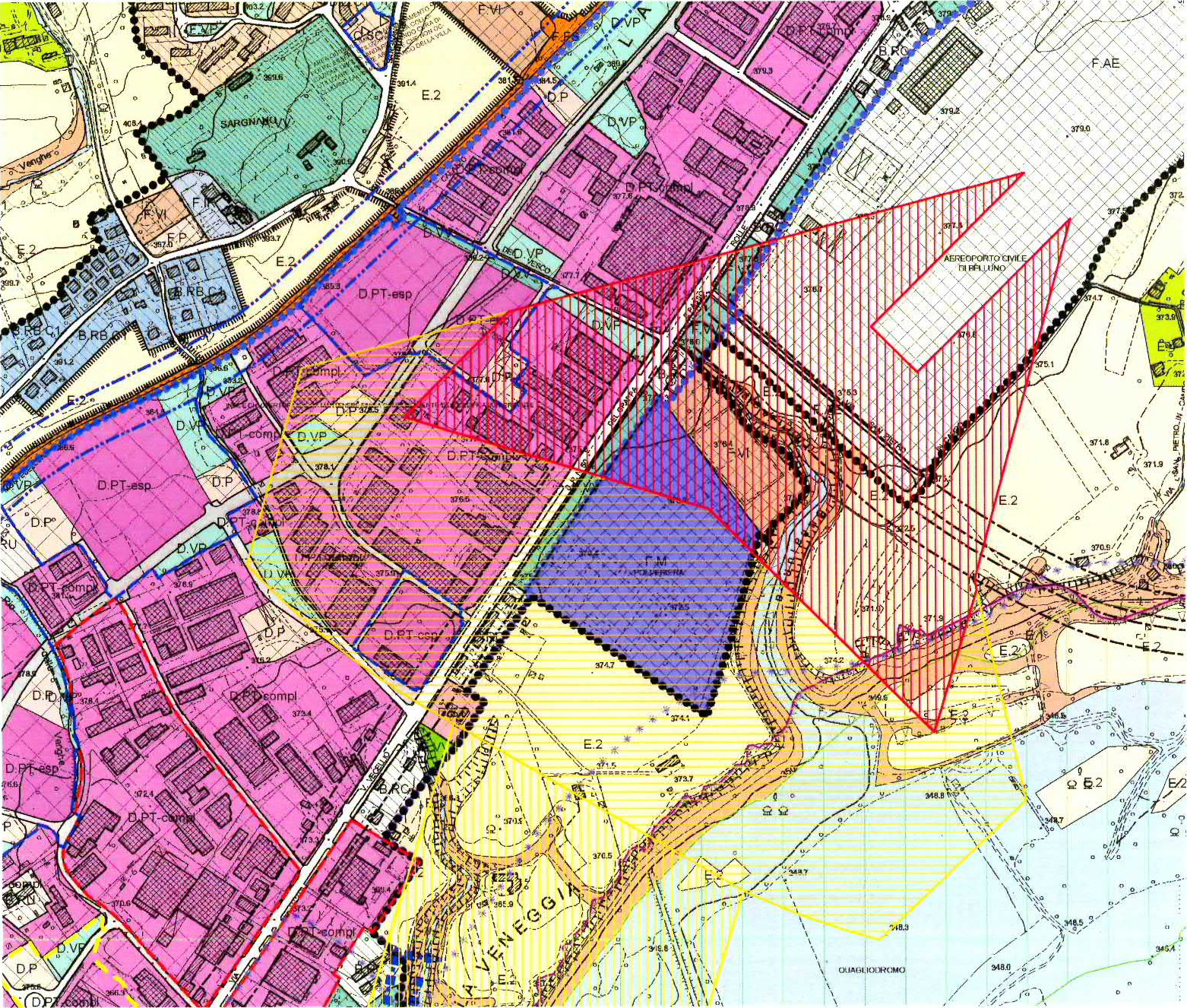 Con la nuova modifica degli azzonati di P.R.G. dell’area, attuata con Delibera di Consiglio Comunale n. 42 del 30/09/2014, è stata stabilita per l’intero compendio la destinazione “F.PS-F.AS” – pubblici servizi ed attrezzature sociali (artt.7.8 e 7.9 delle Norme Tecniche di Attuazione del P.R.G. vigente), eliminando la precedente distinzione in porzioni F.PS, F.II ed F.VV. e rendendo possibile la conformità urbanistica di un’ampia gamma di attività di natura pubblica o di interesse pubblico potenzialmente insediabili, compatibilmente con le limitazioni del Piano di rischio aeroportuale (che ammette, oltre ad una modesta funzione di tipo residenziale, attività non residenziali che comportino la permanenza di un numero limitato di persone, escludendo invece l’insediamento di scuole, ospedali e siti sensibili e di attività che possano comportare pericolo di incendio, esplosione e danno ambientale).