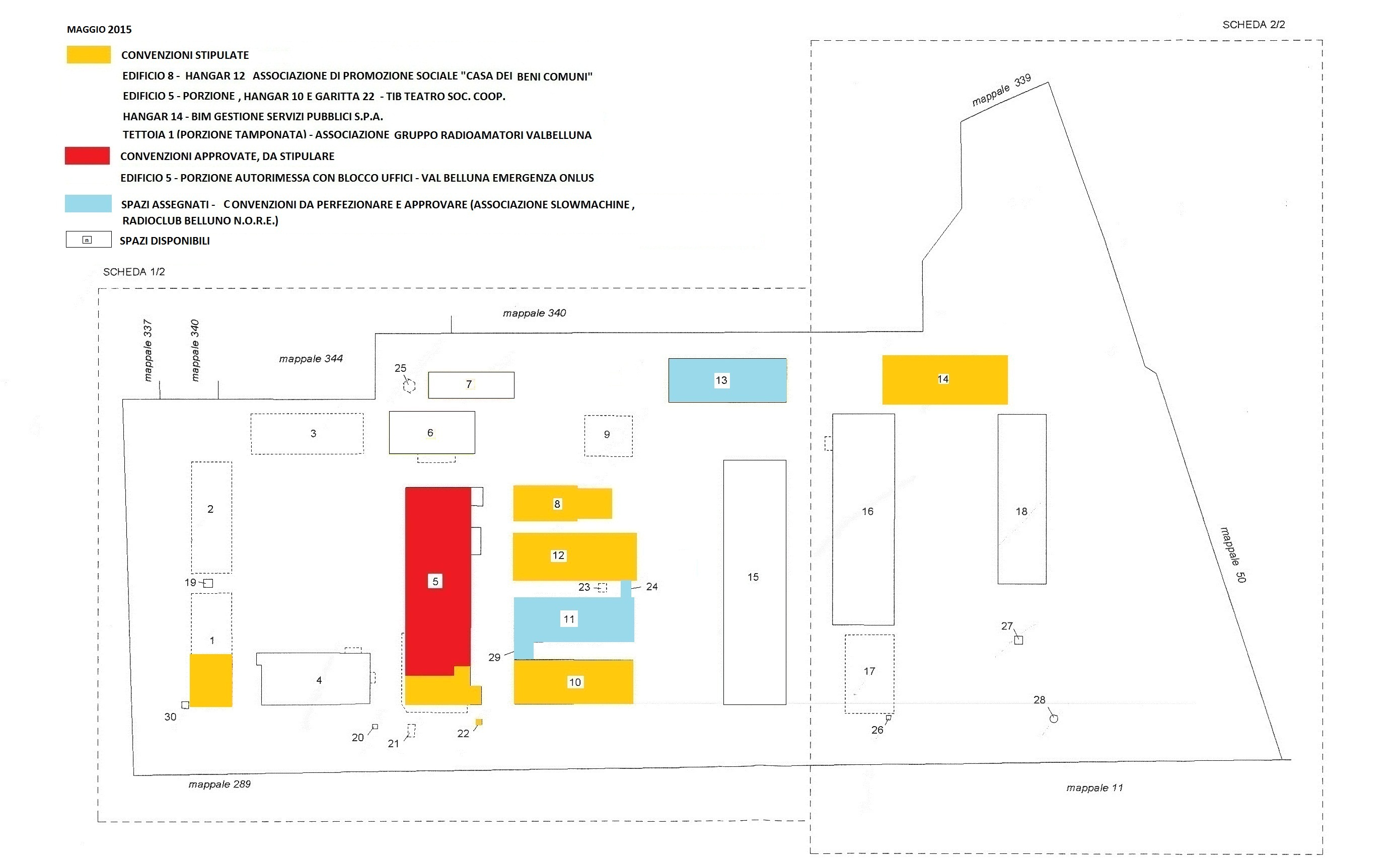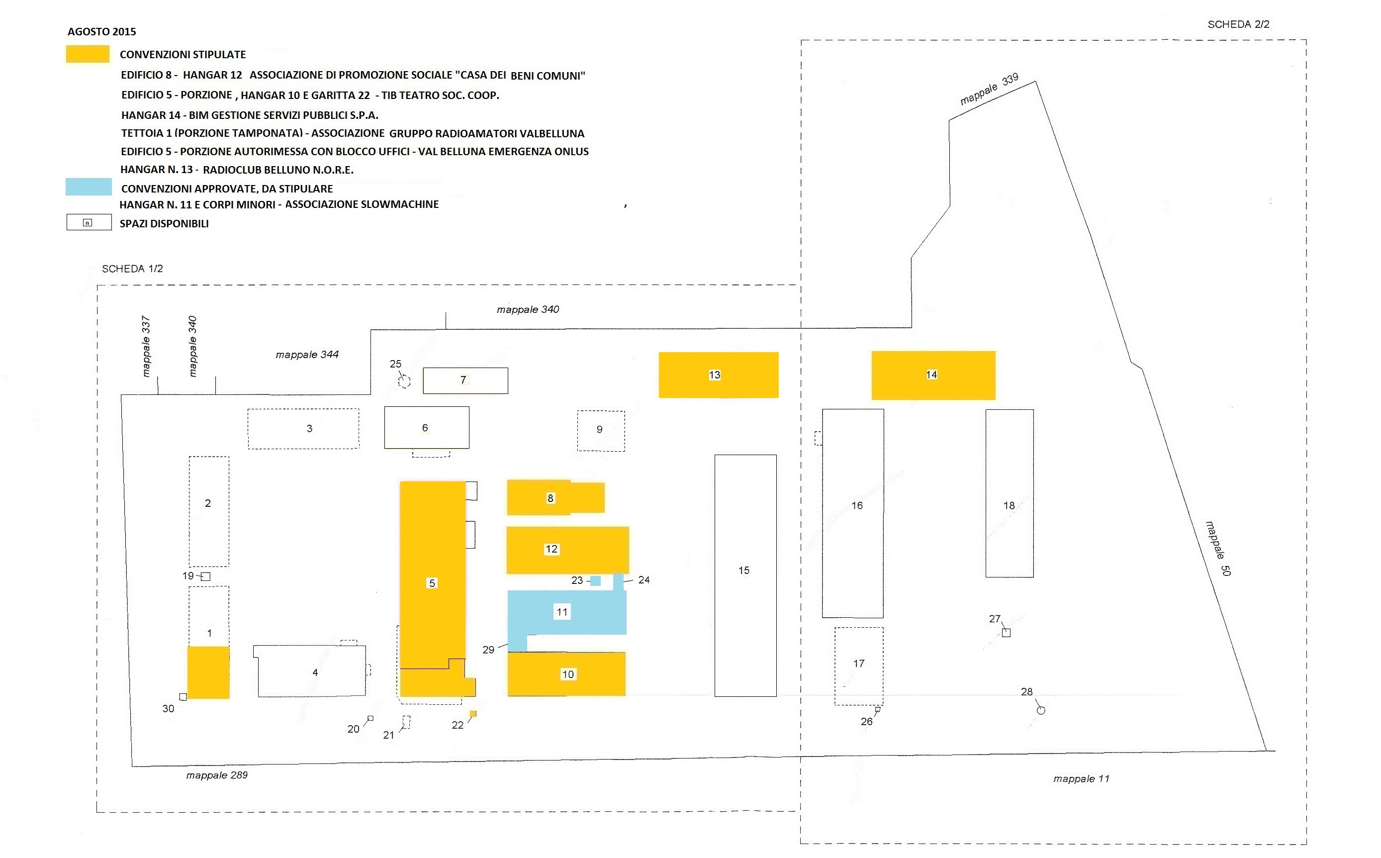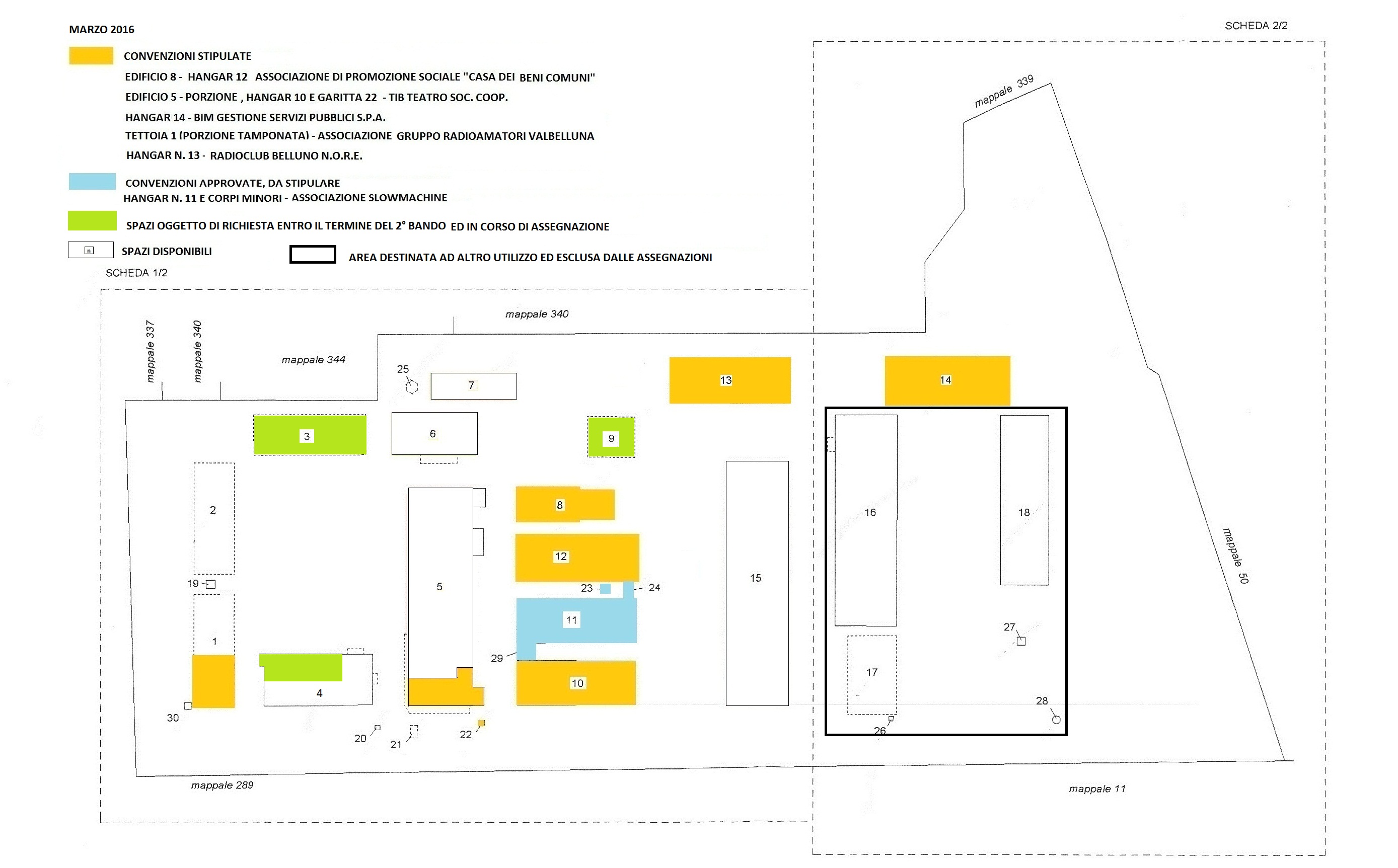 La “Cittadella del terzo settore” finalmente ha assunto un profilo concreto, con l’edificio n. 8 e l’hangar n.12, assegnati alla Associazione di promozione sociale “Casa dei Beni Comuni” per la realizzazione di uno Spazio Sociale Autogestito (con sala polifunzionale per incontri, eventi, assemblee, area per studio e co-working), una porzione dell’edificio n. 5 e l’hangar n.10, assegnati a TIB Teatro Società Cooperativa Sociale O.N.L.U.S. per la realizzazione di un centro permanente di promozione della cultura e dell’arte (con sede operativa e spazi dedicati a scuola di teatro per bambini e giovani, insegnanti ed educatori, adulti e anziani, corsi di danza, laboratori e incontri), l’hangar n. 14, assegnato a BIM Gestione Servizi Pubblici s.p.a. per la realizzazione di una struttura di supporto alle attività di servizio pubblico (con ricovero dei mezzi speciali di proprietà), la porzione chiusa della tettoia n. 1 e l’hangar n. 13, assegnate rispettivamente all’associazione “Gruppo Radioamatori Valbelluna” e all’associazione “Radioclub Belluno N.O.R.E.” per il ricovero e la manutenzione dei mezzi, dei materiali e delle apparecchiature necessari per lo svolgimento delle proprie attività, con particolare riferimento a quelle di protezione civile e l’hangar n.11 ed annessi, assegnati all’associazione Slowmachine, per la realizzazione di un Teatro hangar (spazio artistico destinato ad ospitare laboratori, spettacoli, piccoli concerti ed una sala prove autonoma per il teatro contemporaneo).