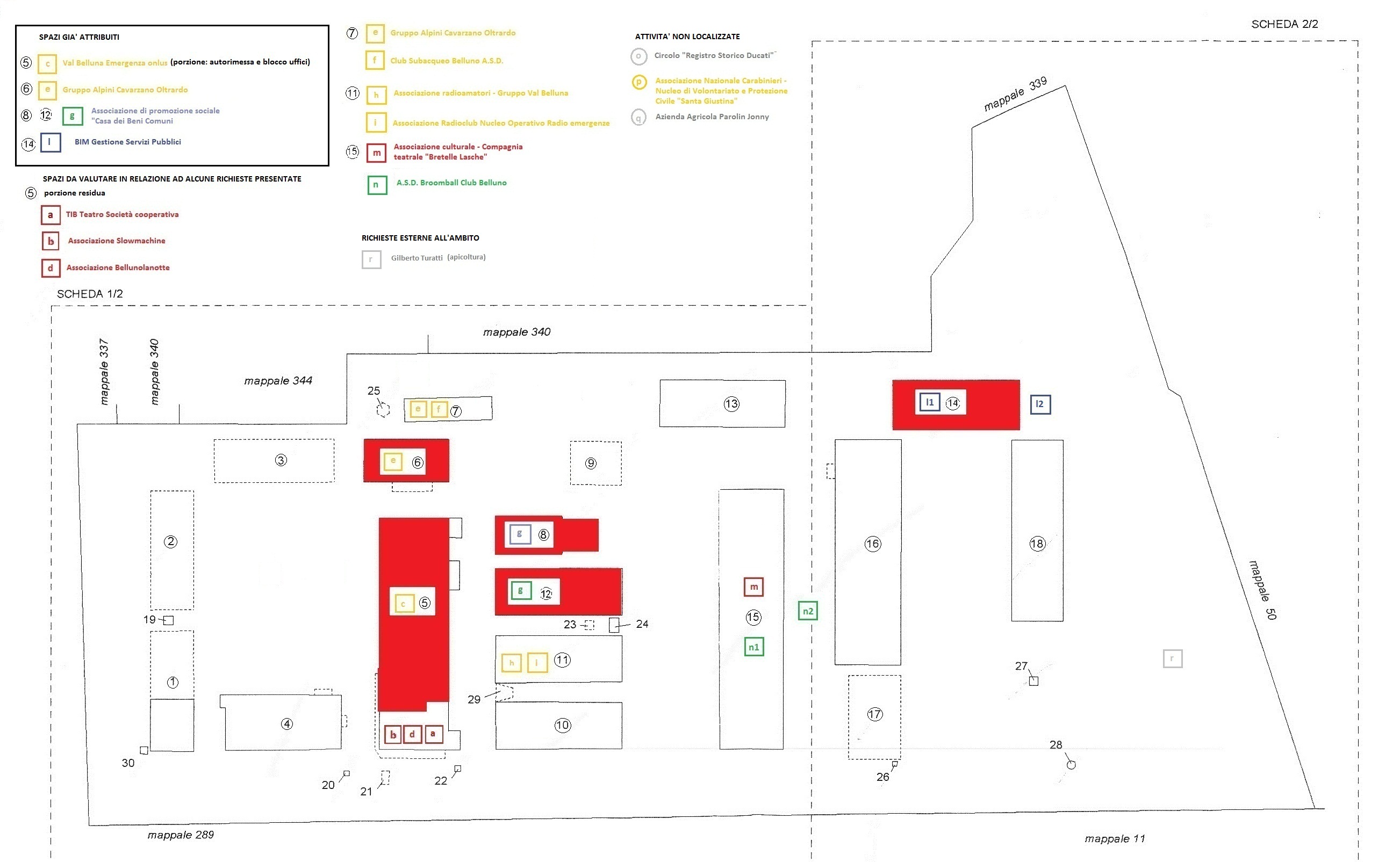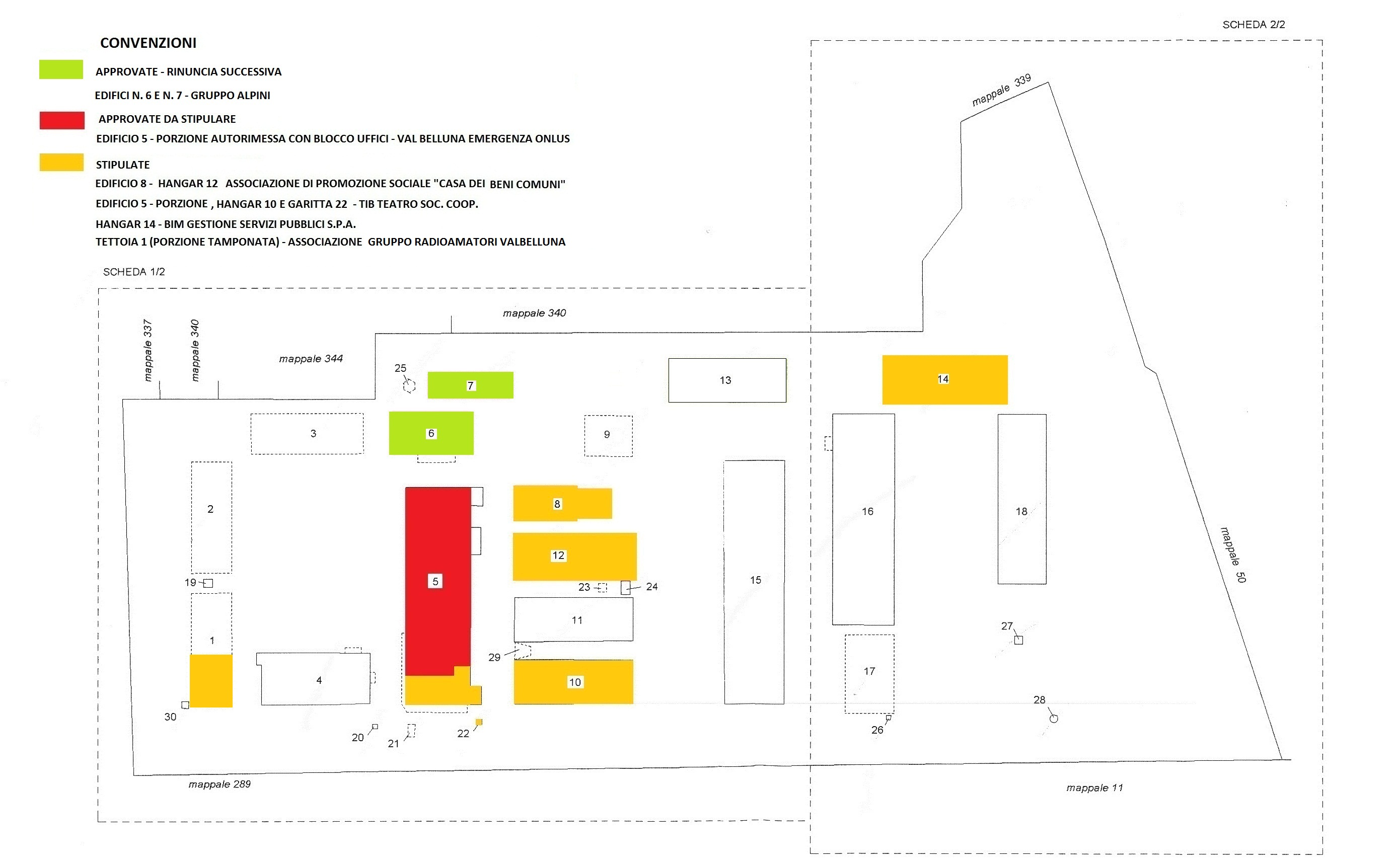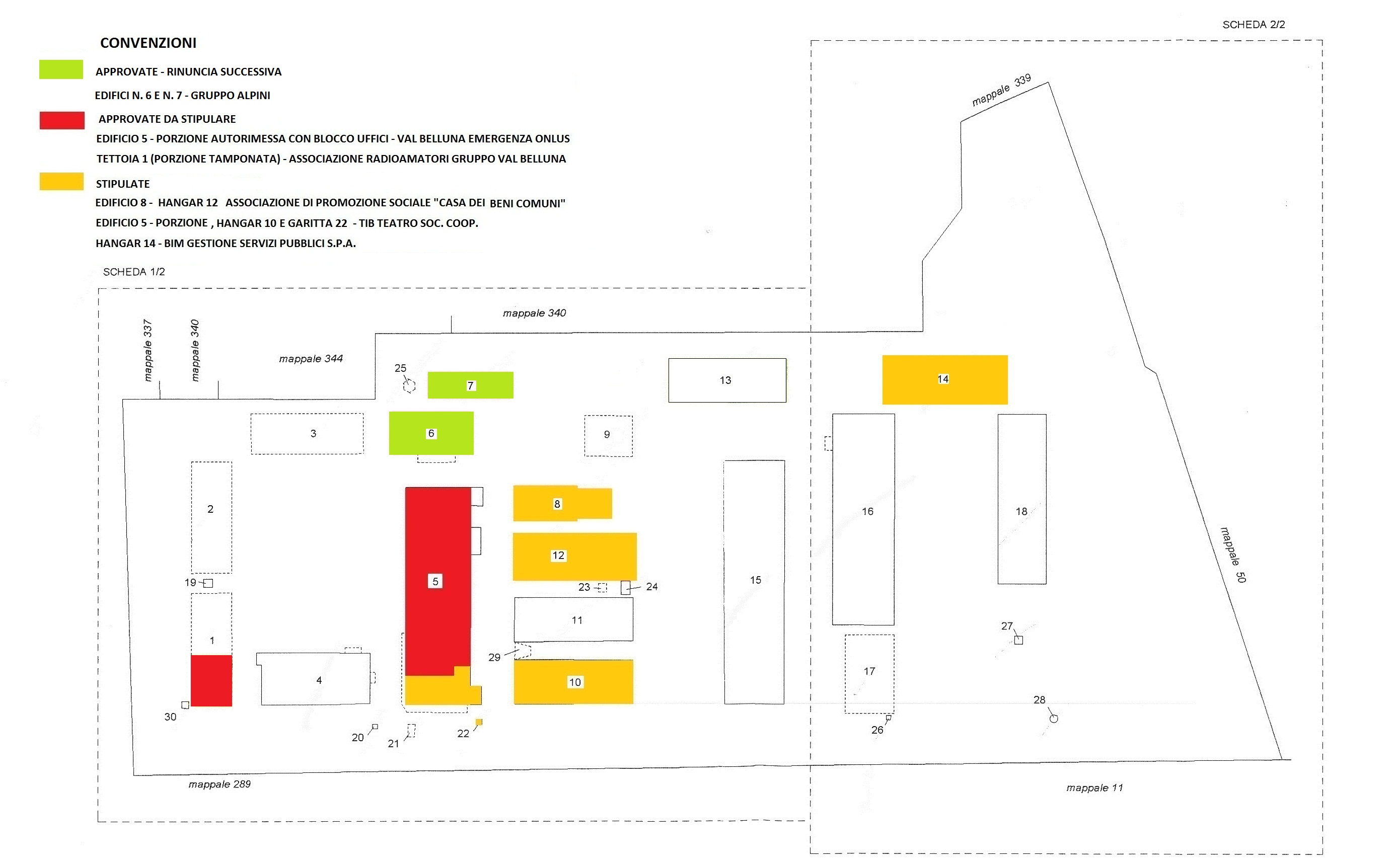 La “Cittadella del terzo settore” finalmente ha assunto un profilo concreto, con l’edificio n. 8 e l’hangar n.12, assegnati alla Associazione di promozione sociale “Casa dei Beni Comuni” per la realizzazione di uno Spazio Sociale Autogestito (con sala polifunzionale per incontri, eventi, assemblee, area per studio e co-working), una porzione dell’edificio n. 5 e l’hangar n.10, assegnati a TIB Teatro Società Cooperativa Sociale O.N.L.U.S. per la realizzazione di un centro permanente di promozione della cultura e dell’arte (con sede operativa e spazi dedicati a scuola di teatro per bambini e giovani, insegnanti ed educatori, adulti e anziani, corsi di danza, laboratori e incontri), l’hangar n. 14, assegnato a BIM Gestione Servizi Pubblici s.p.a. per la realizzazione di una struttura di supporto alle attività di servizio pubblico (con ricovero dei mezzi speciali di proprietà), la porzione chiusa della tettoia n. 1 e l’hangar n. 13, assegnate rispettivamente all’associazione “Gruppo Radioamatori Valbelluna” e all’associazione “Radioclub Belluno N.O.R.E.” per il ricovero e la manutenzione dei mezzi, dei materiali e delle apparecchiature necessari per lo svolgimento delle proprie attività, con particolare riferimento a quelle di protezione civile e l’hangar n.11 ed annessi, assegnati all’associazione Slowmachine, per la realizzazione di un Teatro hangar (spazio artistico destinato ad ospitare laboratori, spettacoli, piccoli concerti ed una sala prove autonoma per il teatro contemporaneo).
